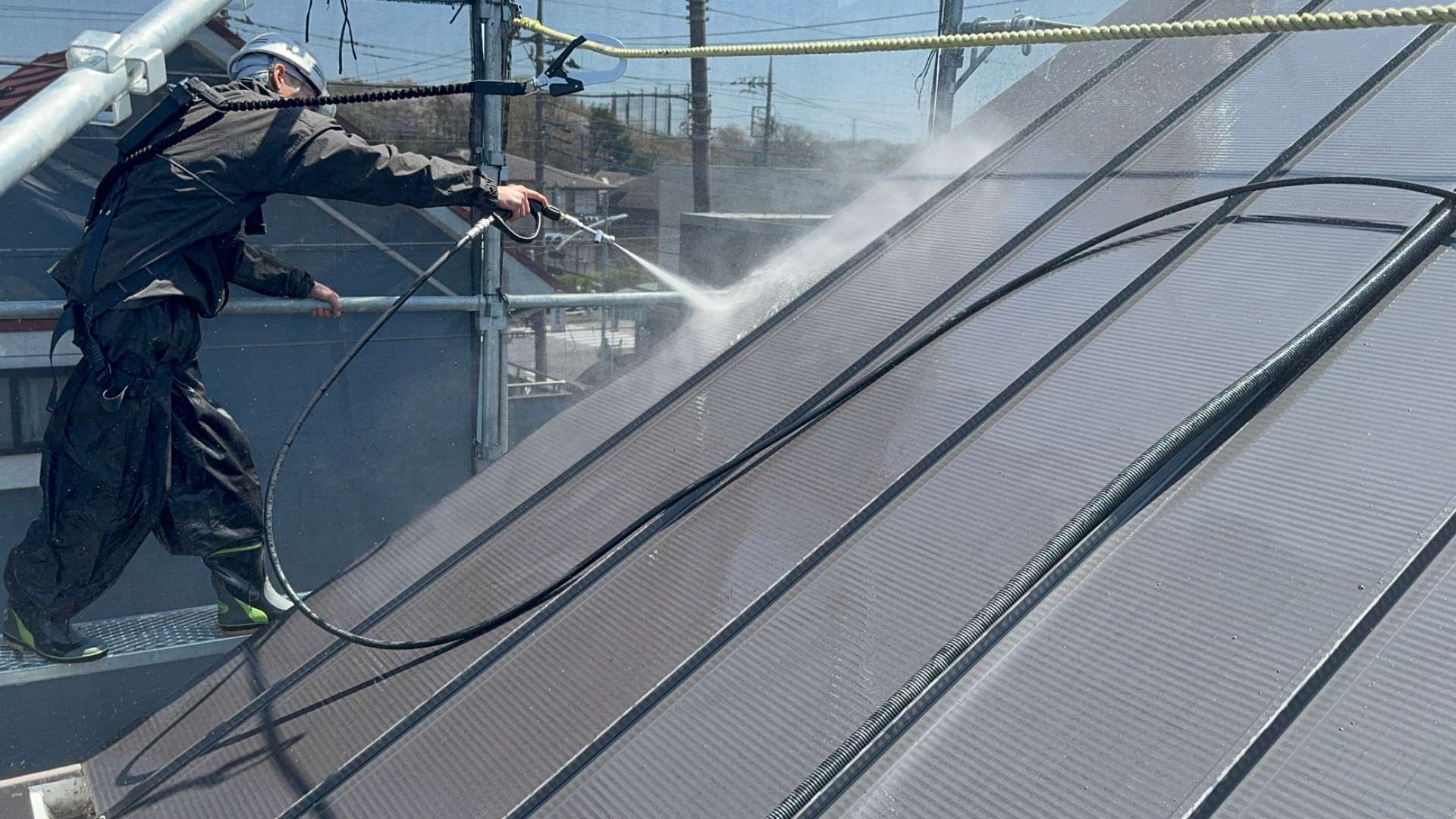 本日は八王子市にて、ガルバニウム鋼板屋根とジョリパットの外壁を高圧洗浄しました。